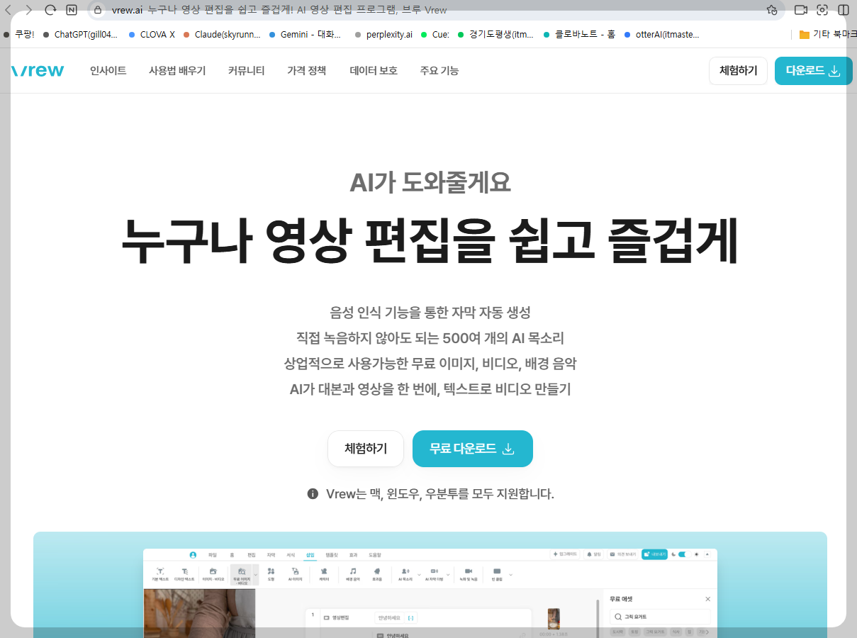영상편집 AI 브루(Vrew) 홈페이지에서 프로그램을 다운 받아 설치합니다.