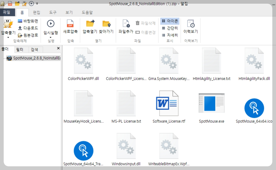 무설치 버전인데, 뭔가 파일이 많아 보여서 흠칫 했지만, 파란색 아이콘중에서 SpotMouse.exe. 클릭해서 실행