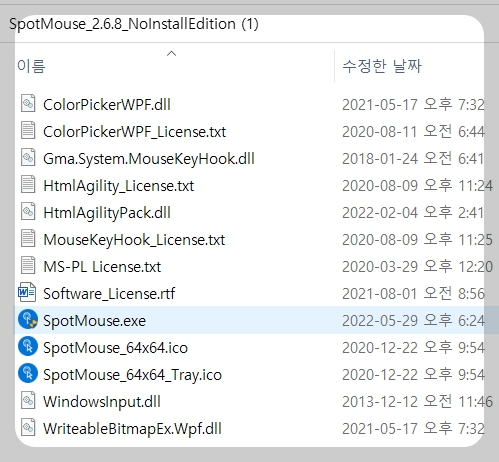 무설치 버전인데, 뭔가 파일이 많아 보여서 흠칫 했지만, 파란색 아이콘중에서 SpotMouse.exe. 클릭해서 실행
