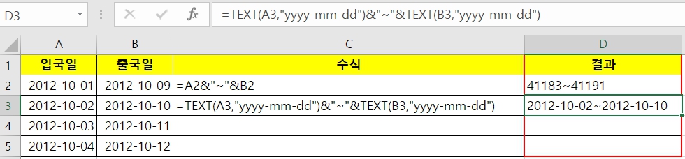 입국일과 출국일이 각각 다른 셀로 되어 있는데