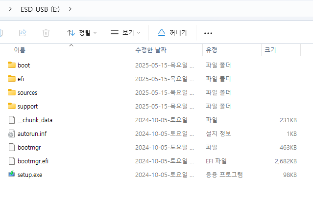4. 윈도우11 설치 파일들이 USB에 저장된 것을 확인하고
