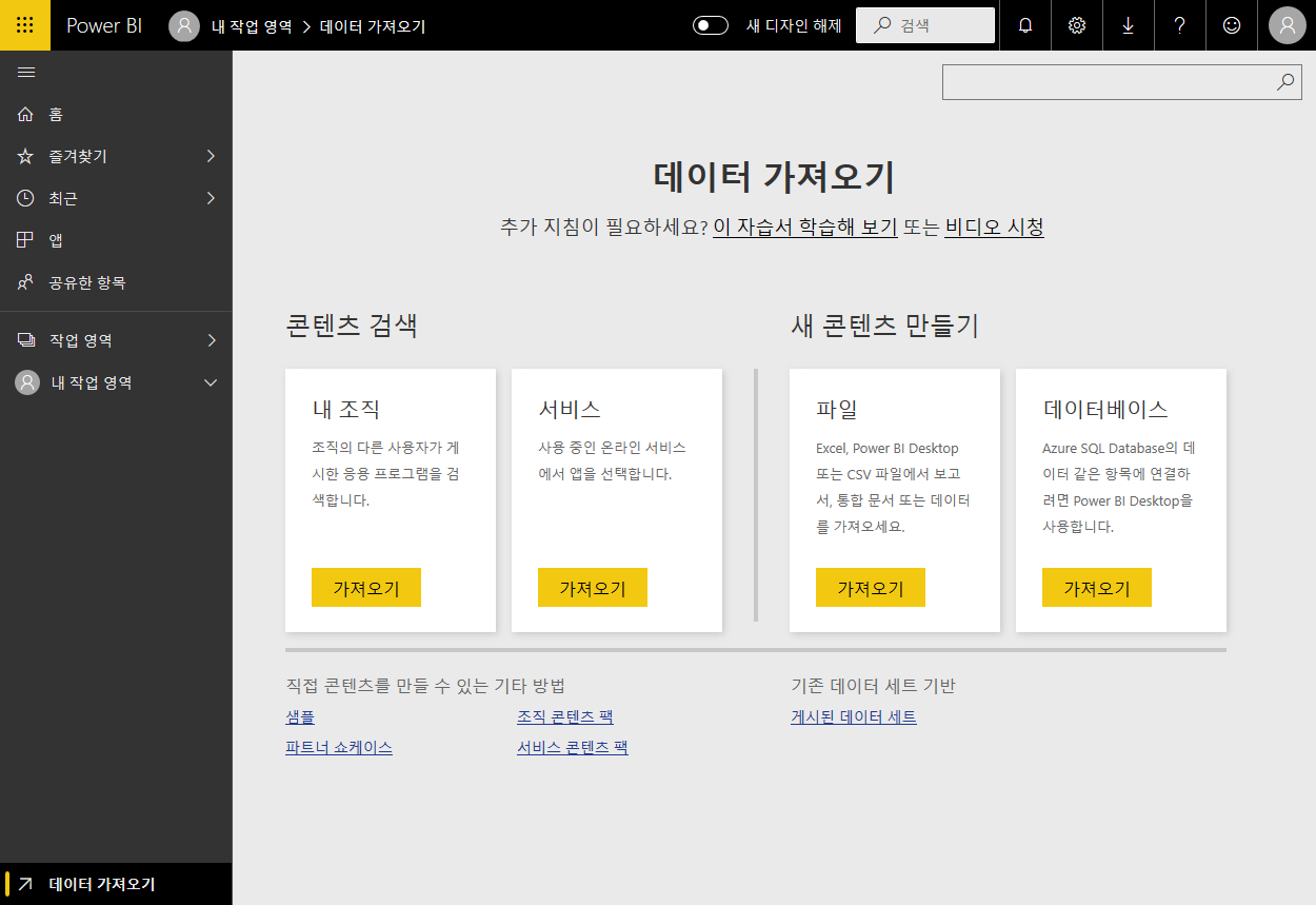 왼쪽 하단 [데이터 가져오기] --> 중앙 [샘플]